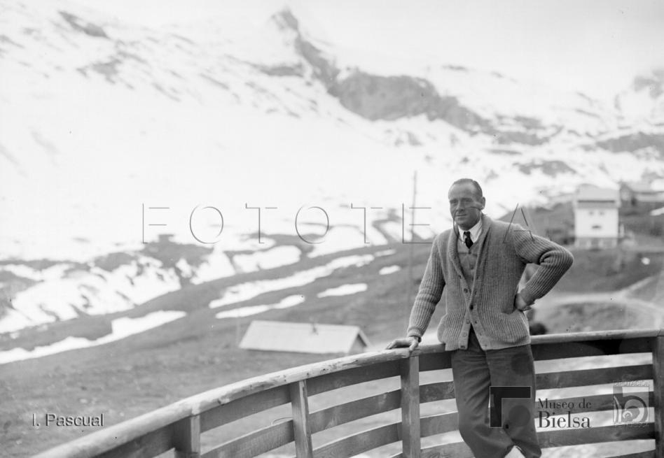 | Contenido: Ismael Pascual Torres en la estación de esquí de Candanchú. En el año 1945 ya lleva unos años en Bielsa, complementando su trabajo con una intensa actividad como fotógrafo. En la imagen se encuentra en una terraza del Hotel Candanchú de la estación de esquí. Nota del autor: ‘Yo en el Tobazo (1945)’. |