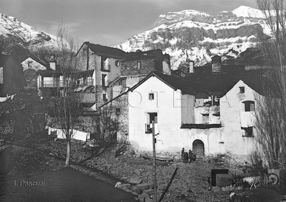 Contenido: Sus primeros destinos en la provincia fueron Torla y Bielsa, durante la década de los años 40 realiza un buen número de fotografías familiares, pero también de los pueblos, paisajes y gentes. Ya establecido en Huesca capital, sigue visitando el Pirineo en las décadas de 1950 y 60, dejando un material valioso para estudiar la evolución de los pueblos y paisajes del Pirineo. Imagen de Torla su primer destino en la provincia de Huesca cuando vuelve de Madrid. |