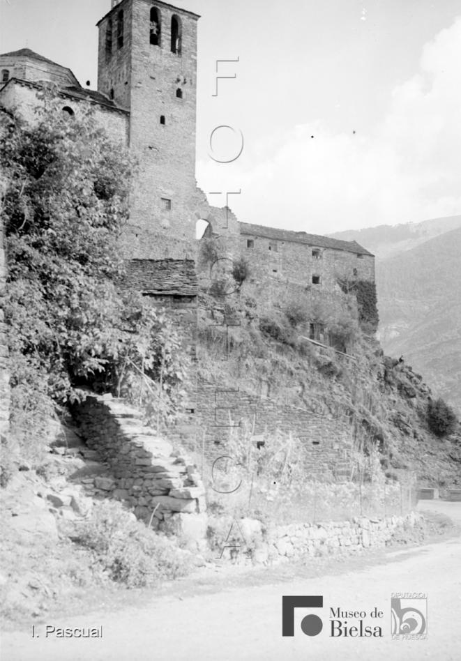 Contenido: Sus primeros destinos en la provincia fueron Torla y Bielsa, durante la década de los años 40 realiza un buen número de fotografías familiares, pero también de los pueblos, paisajes y gentes. Ya establecido en Huesca capital, sigue visitando el Pirineo en las décadas de 1950 y 60, dejando un material valioso para estudiar la evolución de los pueblos y paisajes del Pirineo. Imagen de Torla su primer destino en la provincia de Huesca cuando vuelve de Madrid. |