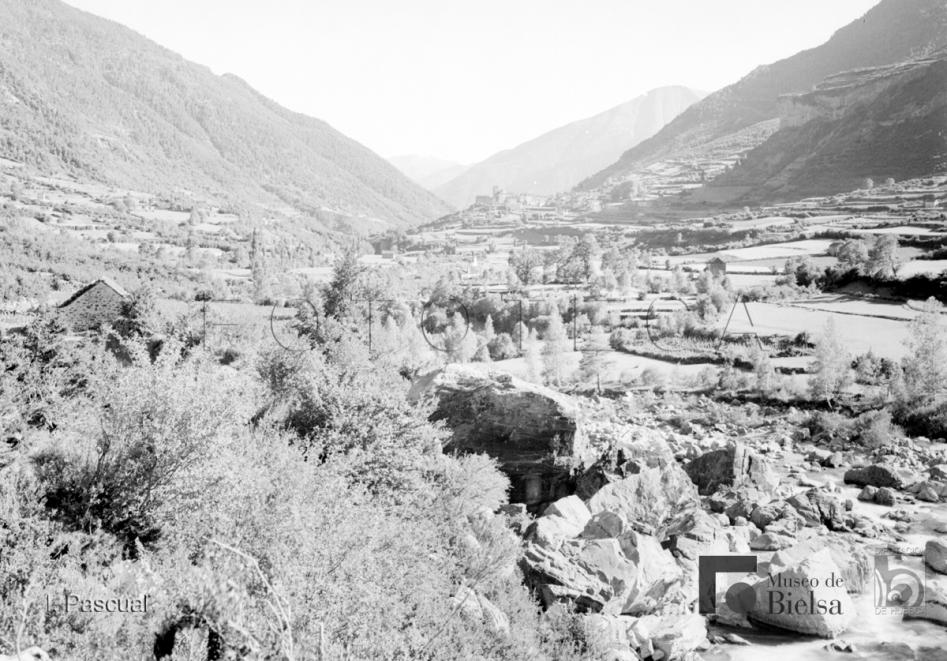 Contenido: Sus primeros destinos en la provincia fueron Torla y Bielsa, durante la década de los años 40 realiza un buen número de fotografías familiares, pero también de los pueblos, paisajes y gentes. Ya establecido en Huesca capital, sigue visitando el Pirineo en las décadas de 1950 y 60, dejando un material valioso para estudiar la evolución de los pueblos y paisajes del Pirineo. Imagen de Torla tomada desde el río Ara, el pueblo se distingue en el centro de la imagen sobre los prados. |