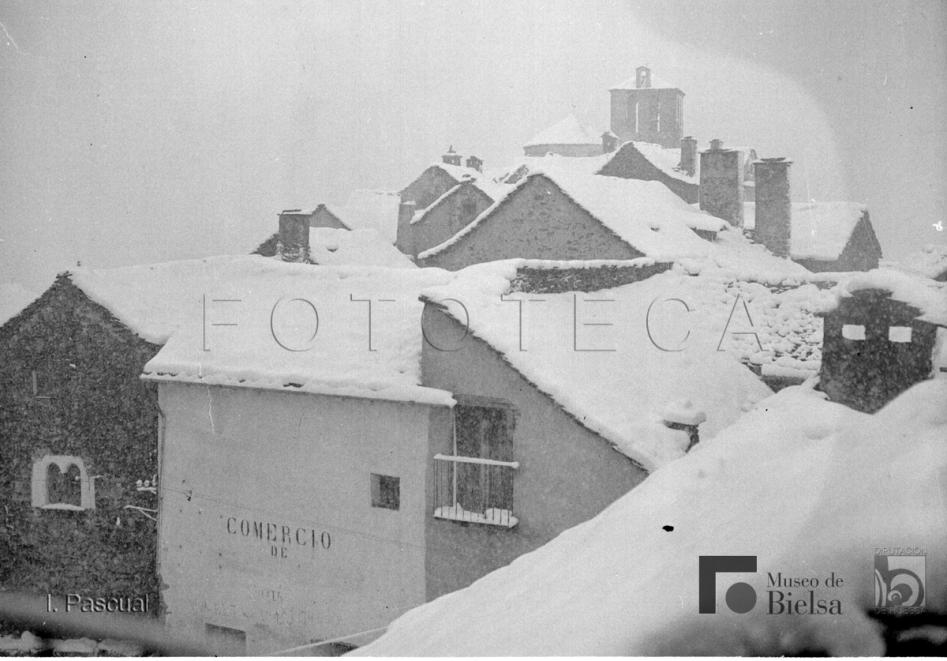 Contenido: Sus primeros destinos en la provincia fueron Torla y Bielsa, durante la década de los años 40 realiza un buen número de fotografías familiares, pero también de los pueblos, paisajes y gentes. Ya establecido en Huesca capital, sigue visitando el Pirineo en las décadas de 1950 y 60, dejando un material valioso para estudiar la evolución de los pueblos y paisajes del Pirineo. Torla en invierno. Nota del autor: ‘Paisaje nevado desde casa Pintado’. |