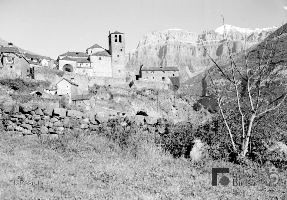 Contenido: Sus primeros destinos en la provincia fueron Torla y Bielsa, durante la década de los años 40 realiza un buen número de fotografías familiares, pero también de los pueblos, paisajes y gentes. Ya establecido en Huesca capital, sigue visitando el Pirineo en las décadas de 1950 y 60, dejando un material valioso para estudiar la evolución de los pueblos y paisajes del Pirineo. Torla, vista del pueblo con el Mondarruego al fondo. |