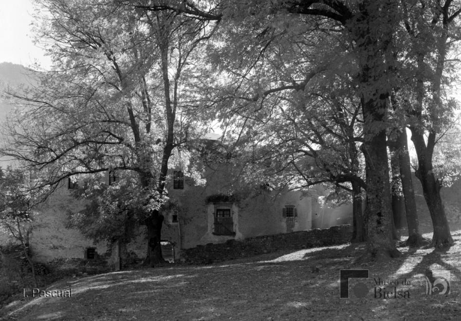 Contenido: Sus primeros destinos en la provincia fueron Torla y Bielsa, durante la década de los años 40 realiza un buen número de fotografías familiares, pero también de los pueblos, paisajes y gentes. Ya establecido en Huesca capital, sigue visitando el Pirineo en las décadas de 1950 y 60, dejando un material valioso para estudiar la evolución de los pueblos y paisajes del Pirineo. Torla, vista parcial de casa Viu. Nota del autor a la imagen: ‘Casa Viu fachada posterior desde el prado’.