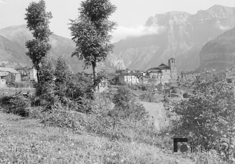 Nota: Sus primeros destinos en la provincia fueron Torla y Bielsa, durante la década de los años 40 realiza un buen número de fotografías familiares, pero también de los pueblos, paisajes y gentes. Ya establecido en Huesca capital, sigue visitando el Pirineo en las décadas de 1950 y 60, dejando un material valioso para estudiar la evolución de los pueblos y paisajes del Pirineo. Torla, vista desde el sur con el Mondarruego al fondo. |