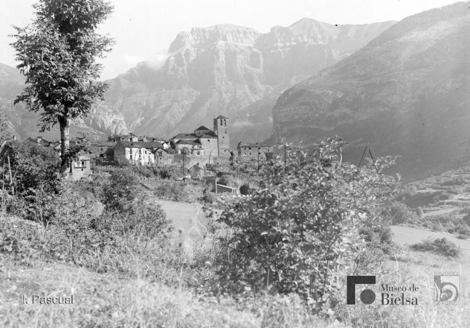Contenido: Sus primeros destinos en la provincia fueron Torla y Bielsa, durante la década de los años 40 realiza un buen número de fotografías familiares, pero también de los pueblos, paisajes y gentes. Ya establecido en Huesca capital, sigue visitando el Pirineo en las décadas de 1950 y 60, dejando un material valioso para estudiar la evolución de los pueblos y paisajes del Pirineo. Torla, vista desde el sur con el Mondarruego al fondo. |