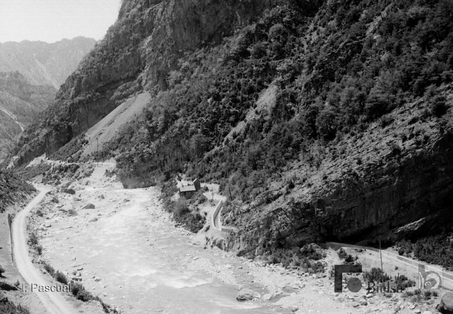 Contenido: Imágenes de Bielsa y del valle. Desde que conoció Bielsa a principios de la década de 1940, Ismael Pascual realiza fotografías de Bielsa y del valle donde se reflejan los cambios producidos por la reconstrucción del pueblo tras la guerra y por las obras hidráulicas en la cabecera del río Cinca. También realiza muchas salidas de alta montaña con un guía y en ocasiones con amigos y familiares. Canalización en el río Cinca, entre Salinas y Bielsa para la producción eléctrica en la minicentral de San Marcial, situada entre las Devotas y Salinas. A la izquierda de la imagen la carretera de acceso a Bielsa todavía sin asfaltar. |