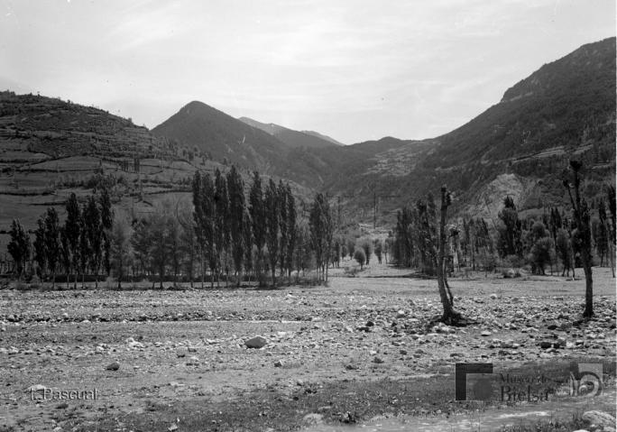 Contenido: Sus primeros destinos en la provincia fueron Torla y Bielsa, durante la década de los años 40 realiza un buen número de fotografías familiares, pero también de los pueblos, paisajes y gentes. Ya establecido en Huesca capital, sigue visitando el Pirineo en las décadas de 1950 y 60, dejando un material valioso para estudiar la evolución de los pueblos y paisajes del Pirineo. Plan, el cauce del río Cinqueta, (en primer plano, al fondo el puerto de Sahún. |