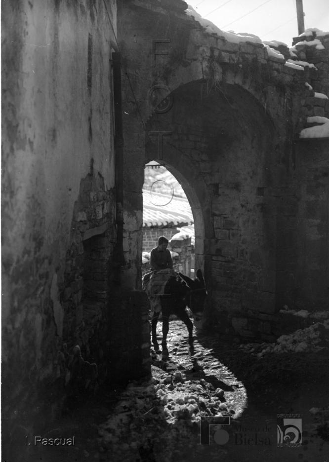 Contenido: Sus primeros destinos en la provincia fueron Torla y Bielsa, durante la década de los años 40 realiza un buen número de fotografías familiares, pero también de los pueblos, paisajes y gentes. Ya establecido en Huesca capital, sigue visitando el Pirineo en las décadas de 1950 y 60, dejando un material valioso para estudiar la evolución de los pueblos y paisajes del Pirineo. Aínsa, portal bajo. Acceso al pueblo antiguo por la zona sur de la muralla. Este portal se conserva en la actualidad. |