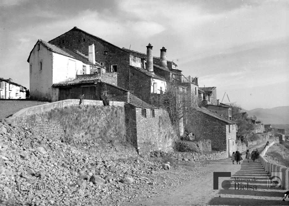 Contenido: Sus primeros destinos en la provincia fueron Torla y Bielsa, durante la década de los años 40 realiza un buen número de fotografías familiares, pero también de los pueblos, paisajes y gentes. Ya establecido en Huesca capital, sigue visitando el Pirineo en las décadas de 1950 y 60, dejando un material valioso para estudiar la evolución de los pueblos y paisajes del Pirineo. Aínsa, acceso al pueblo antiguo por la plaza, este acceso es el que se ensanchó para acceder con vehículos a motor, en las imágenes de principios del siglo XX todavía se conservaba en la muralla y su puerta de acceso. Imagen de los años 40 antes de la reconstrucción. |