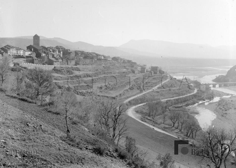 Contenido: Sus primeros destinos en la provincia fueron Torla y Bielsa, durante la década de los años 40 realiza un buen número de fotografías familiares, pero también de los pueblos, paisajes y gentes. Ya establecido en Huesca capital, sigue visitando el Pirineo en las décadas de 1950 y 60, dejando un material valioso para estudiar la evolución de los pueblos y paisajes del Pirineo. Aínsa, imagen de los años 40 antes de la reconstrucción tomada desde la zona de la Solana, todavía se trabajan los campos de la ladera. A la derecha de la imagen la carretera de Boltaña, el río Ara y el puente reconstruido. |
