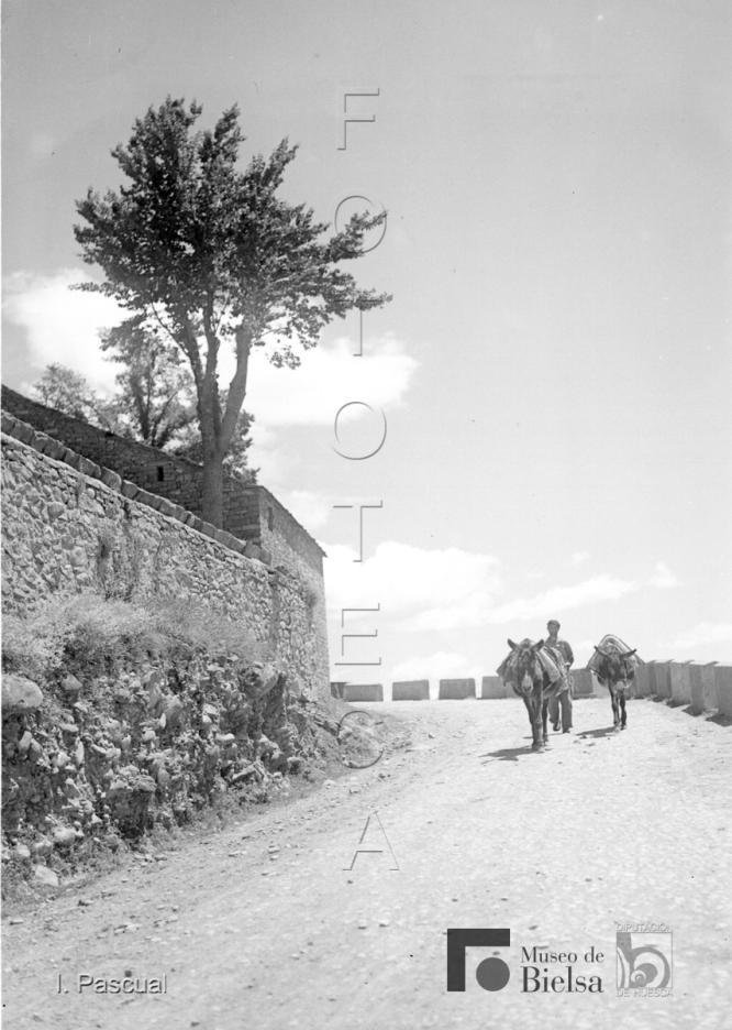 Contenido: Sus primeros destinos en la provincia fueron Torla y Bielsa, durante la década de los años 40 realiza un buen número de fotografías familiares, pero también de los pueblos, paisajes y gentes. Ya establecido en Huesca capital, sigue visitando el Pirineo en las décadas de 1950 y 60, dejando un material valioso para estudiar la evolución de los pueblos y paisajes del Pirineo. Aínsa, en la carretera de acceso al pueblo antiguo. |