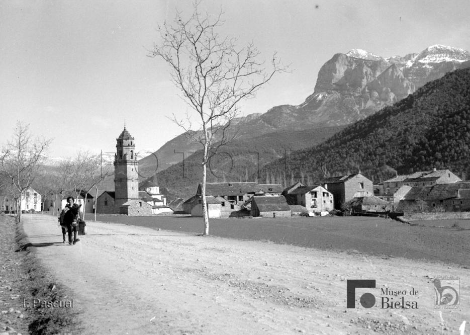 Contenido: Sus primeros destinos en la provincia fueron Torla y Bielsa, durante la década de los años 40 realiza un buen número de fotografías familiares, pero también de los pueblos, paisajes y gentes. Ya establecido en Huesca capital, sigue visitando el Pirineo en las décadas de 1950 y 60, dejando un material valioso para estudiar la evolución de los pueblos y paisajes del Pirineo. Labuerda, imagen tomada a la entrada desde la carretera de Aínsa a Bielsa. A la derecha la Peña Montañesa. |