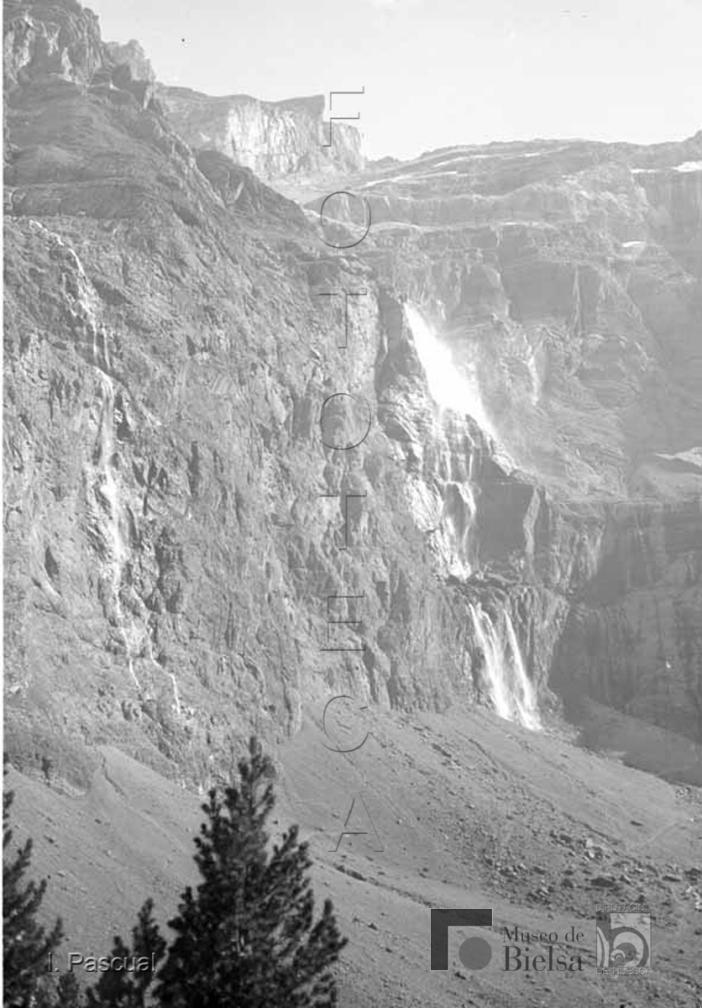 Contenido: Imágenes de Bielsa y del valle. Desde que conoció Bielsa a principios de la década de 1940, Ismael Pascual realiza fotografías de Bielsa y del valle donde se reflejan los cambios producidos por la reconstrucción del pueblo tras la guerra y por las obras hidráulicas en la cabecera del río Cinca. También realiza muchas salidas de alta montaña con un guía y en ocasiones con amigos y familiares. > Ismael Pascual con el guía Antonio Noguero de casa Pichón de Bielsa y en ocasiones con amigos, hacen abundantes salidas a la alta montaña del entorno. Grupo de imágenes realzadas en la vertiente francesa del macizo: Circo y cascada de Gavarnie. |