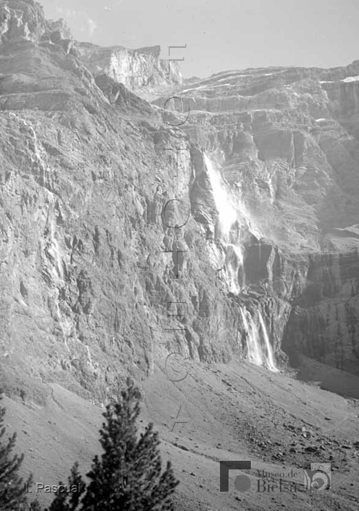 Contenido: Imágenes de Bielsa y del valle. Desde que conoció Bielsa a principios de la década de 1940, Ismael Pascual realiza fotografías de Bielsa y del valle donde se reflejan los cambios producidos por la reconstrucción del pueblo tras la guerra y por las obras hidráulicas en la cabecera del río Cinca. También realiza muchas salidas de alta montaña con un guía y en ocasiones con amigos y familiares. Ismael Pascual con el guía Antonio Noguero de casa Pichón de Bielsa y en ocasiones con amigos, hacen abundantes salidas a la alta montaña del entorno. Grupo de imágenes realzadas en la vertiente francesa del macizo: Circo y cascada de Gavarnie. |