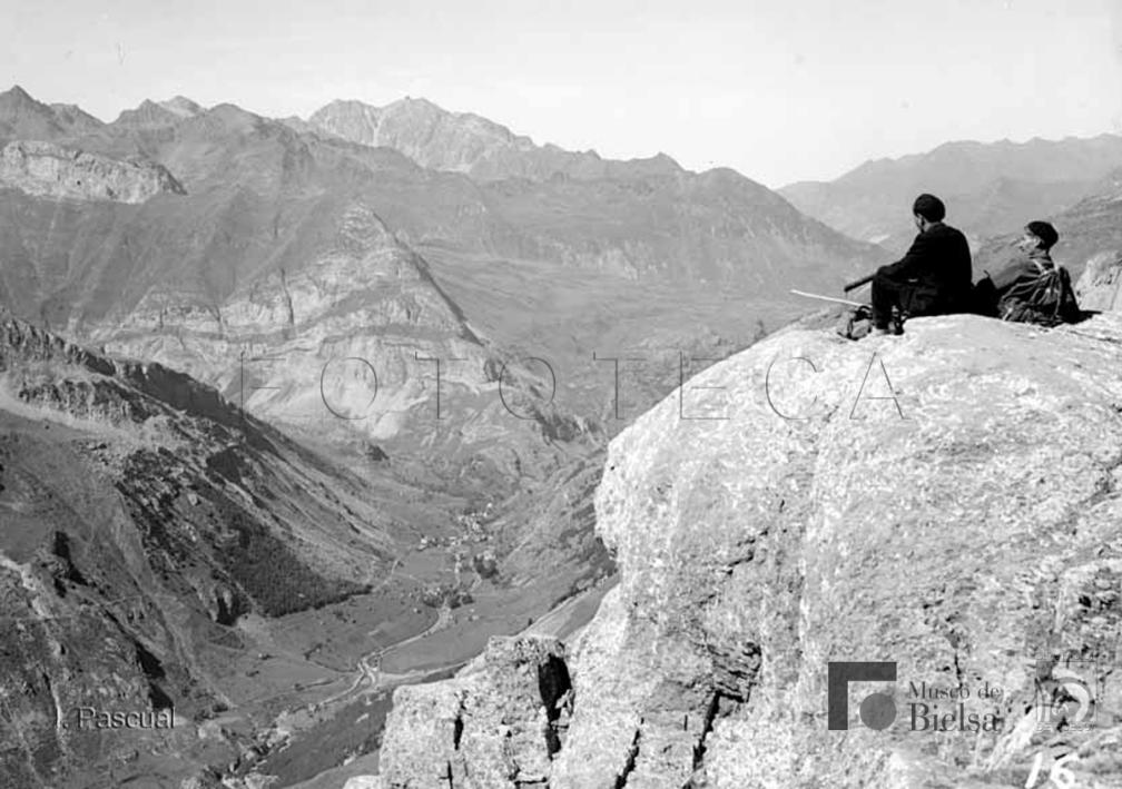 Contenido: Vista panorámica de Gavarnie poco habitual, tomada desde la cara norte del Astazu y el Marboré hacia el noroeste, en el fondo del valle el pueblo de Gavarnie. Imágenes de Bielsa y del valle. Desde que conoció Bielsa a principios de la década de 1940, Ismael Pascual realiza fotografías de Bielsa y del valle donde se reflejan los cambios producidos por la reconstrucción del pueblo tras la guerra y por las obras hidráulicas en la cabecera del río Cinca. También realiza muchas salidas de alta montaña con un guía y en ocasiones con amigos y familiares.