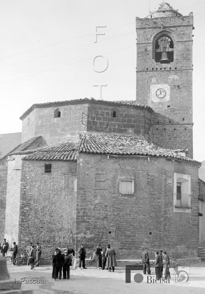 Contenido: Grupo de imágenes de Boltaña realizadas hacia 1943. En esta imagen detalle de la plaza Mayor y de la iglesia. Sus primeros destinos en la provincia fueron Torla y Bielsa, durante la década de los años 40 realiza un buen número de fotografías familiares, pero también de los pueblos, paisajes y gentes. Ya establecido en Huesca capital, sigue visitando el Pirineo en las décadas de 1950 y 60, dejando un material valioso para estudiar la evolución de los pueblos y paisajes del Pirineo. |
