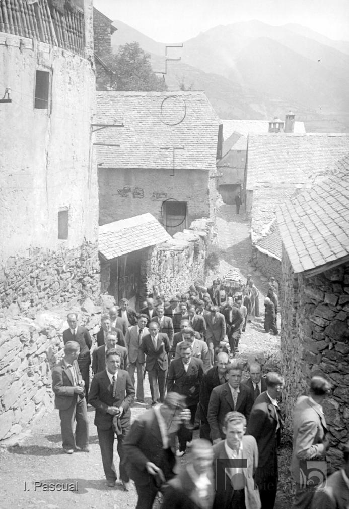 Contenido: Grupo de imágenes de Gistaín realizadas hacia 1943. Imagen parcial de la procesión. Sus primeros destinos en la provincia fueron Torla y Bielsa, durante la década de los años 40 realiza un buen número de fotografías familiares, pero también de los pueblos, paisajes y gentes. Ya establecido en Huesca capital, sigue visitando el Pirineo en las décadas de 1950 y 60, dejando un material valioso para estudiar la evolución de los pueblos y paisajes de la provincia. |