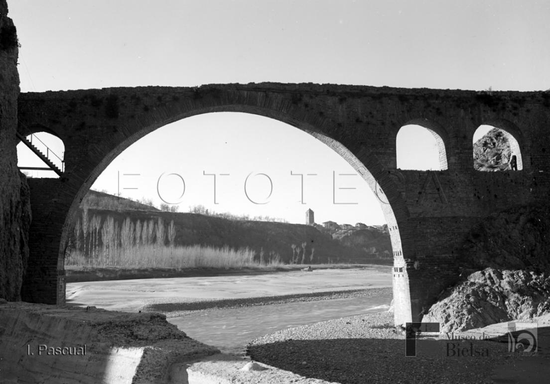 Contenido: Grupo de imágenes de Mediano realizadas hacia 1943. Imagen del puente del Diablo que cruzaba el río Cinca y que quedó bajo las aguas del embalse. En primer plano parte de las obras de la presa que se habían retomado al finalizar la guerra. Sus primeros destinos en la provincia fueron Torla y Bielsa, durante la década de los años 40 realiza un buen número de fotografías familiares, pero también de los pueblos, paisajes y gentes. Ya establecido en Huesca capital, sigue visitando el Pirineo en las décadas de 1950 y 60, dejando un material valioso para estudiar la evolución de los pueblos y paisajes de la provincia. |