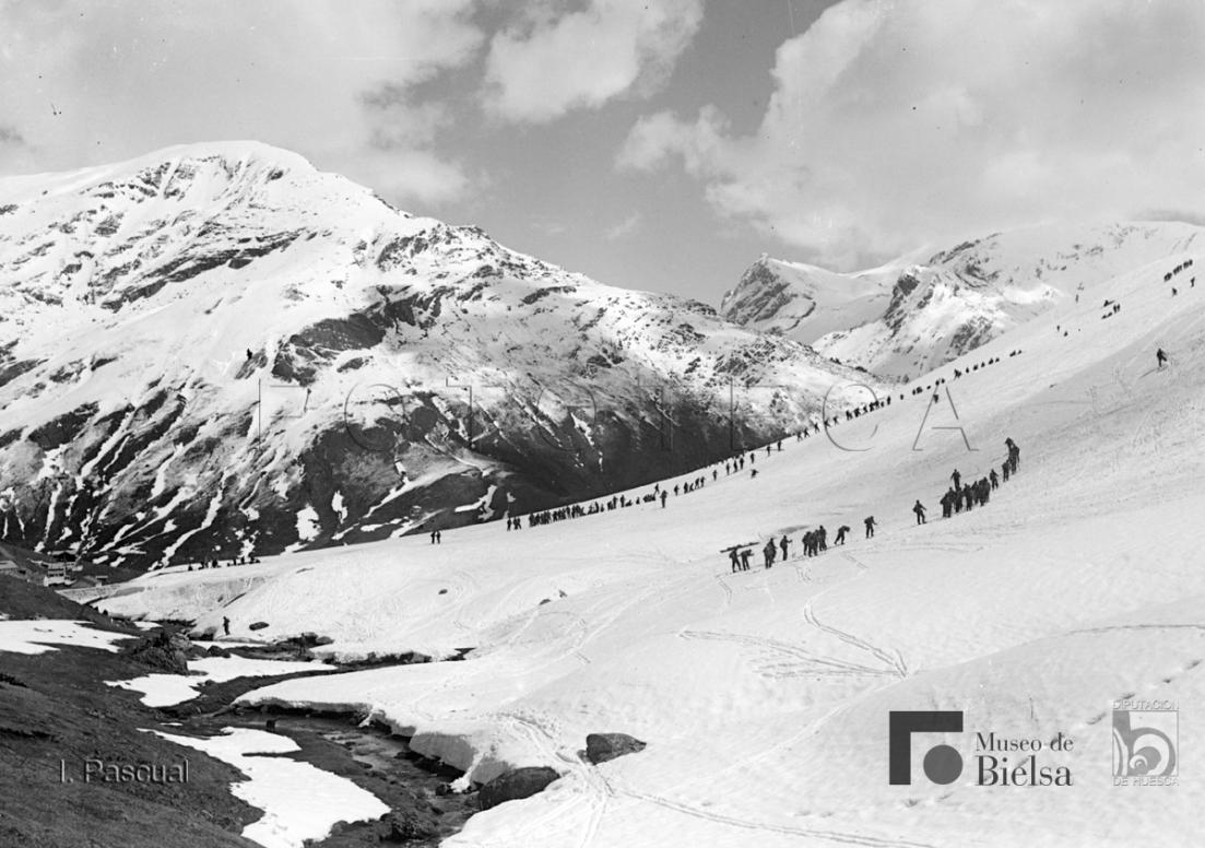 Nota: Ismael Pascual Torres nace en el año 1907 y vive la mayor parte de su juventud en la ciudad de Huesca. Hacia 1930 se traslada a Madrid y oposita al cuerpo nacional de Policía. Tras la guerra civil pide traslado a la provincia de Huesca, siendo sus destinos Torla, Bielsa y Huesca capital. En 1945 se casa con Pilar de Antonio de casa Pello de Bielsa. Tiene contacto habitual con D. Ricardo Compairé. En sus fotografías trata todos los temas, la vida cotidiana de las gentes y sus fiestas, los paisajes de alta montaña y los pueblos de los valles donde vive y que visita también en sus salidas y excursiones. Más información sobre el autor en la web del museo de Bielsa. |
