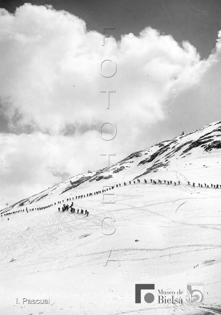 Nota: Ismael Pascual Torres nace en el año 1907 y vive la mayor parte de su juventud en la ciudad de Huesca. Hacia 1930 se traslada a Madrid y oposita al cuerpo nacional de Policía. Tras la guerra civil pide traslado a la provincia de Huesca, siendo sus destinos Torla, Bielsa y Huesca capital. En 1945 se casa con Pilar de Antonio de casa Pello de Bielsa. Tiene contacto habitual con D. Ricardo Compairé. En sus fotografías trata todos los temas, la vida cotidiana de las gentes y sus fiestas, los paisajes de alta montaña y los pueblos de los valles donde vive y que visita también en sus salidas y excursiones. Más información sobre el autor en la web del museo de Bielsa. |