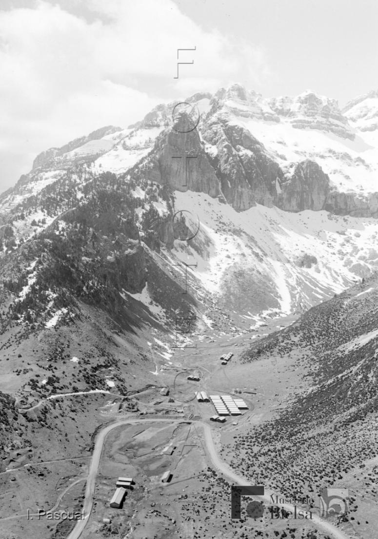 | Contenido: Grupo de fotografías tomadas en la cabecera del valle del Aragón. Corresponden a imágenes de los pasos fronterizos, instalaciones civiles y militares y maniobras militares en montaña de una unidad de esquiadores. Imagen panorámica del barranco de Rioseta con los barracones militares. |