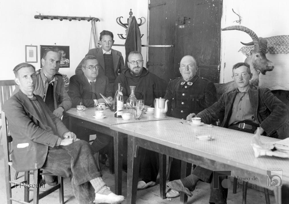 Contenido: Torla, grupo en Casa Oliván, detrás el bucardo disecado que aparece en muchas imágenes de la época. Sus primeros destinos en la provincia fueron Torla y Bielsa, durante la década de los años 40 realiza un buen número de fotografías familiares, pero también de los pueblos, paisajes y gentes. |