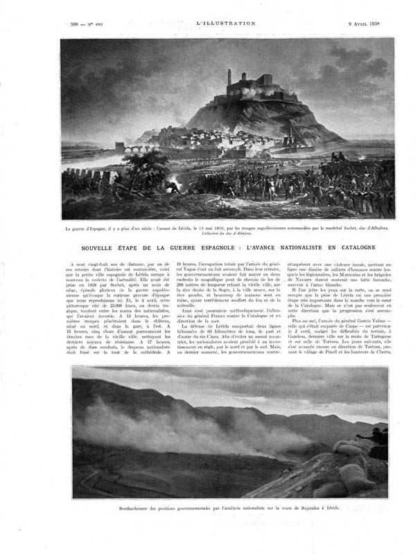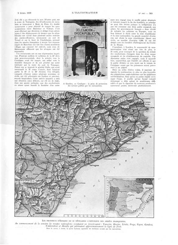 Contenido: "Nouvelle etape de la guerre Espagnola: l'avance nationaliste en Catalogna". L'Illustration, nº 4962, 09-04-1938, pp. 368-371. Artículo que recoge los avances de las tropas franquistas hacia Cataluña.
