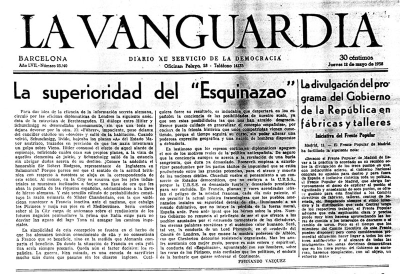 | Contenido: "La superioridad del Esquinazao".La Vanguardia, nº 23140, 12-05-1938. p. 1. Artículo firmado por Fernando Vázquez en el que analiza los movimientos diplomáticos europeos con respecto a la guerra y el fascismo, estableciendo la conducta de la 43ª División y su resistencia en el pirineo altoaragonés como un ejemplo que perdurará en la historia. |