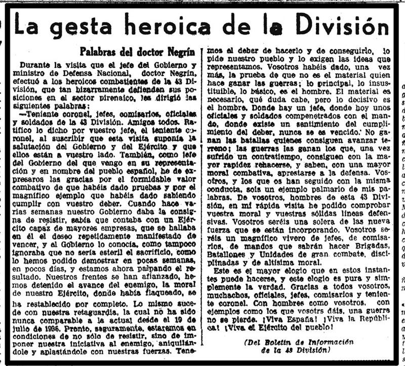 | Contenido: La Vanguardia, nº 23150, 24-05-1938, p. 7. Contiene el discurso, sacado del Boletín de Información de la 43ª División, hecho por Juan Negrín a la 43ª División en su visita del 15 de mayo de 1938. |