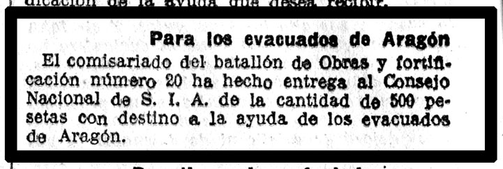 | Contenido: La Vanguardia, nº 23150, 24-05-1938, p. 6. Noticia de que el Comisariado del Batallón de Obras y Fortificación nº 20 ha entregado al Consejo Nacional del S.I.A. 500 pesetas para los evacuados de Aragón. |