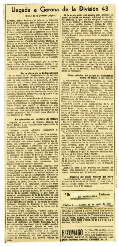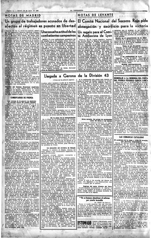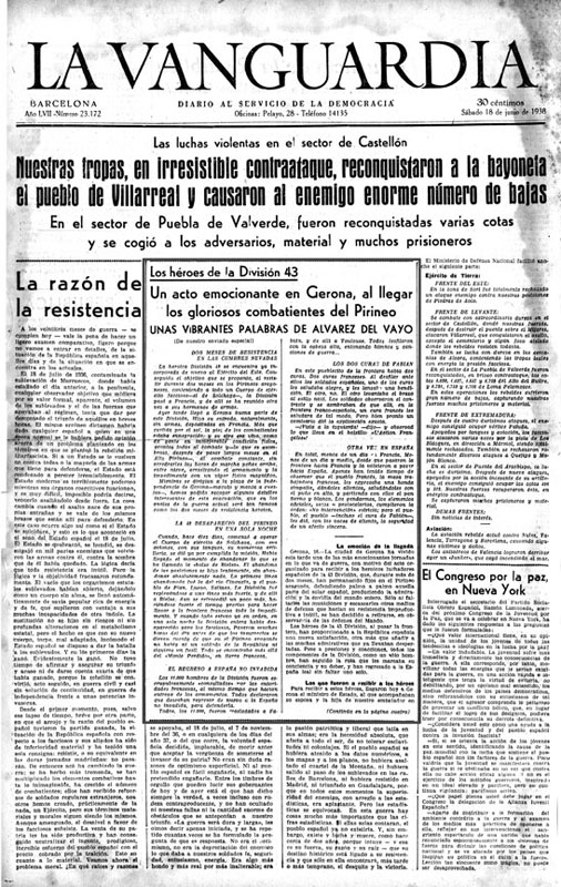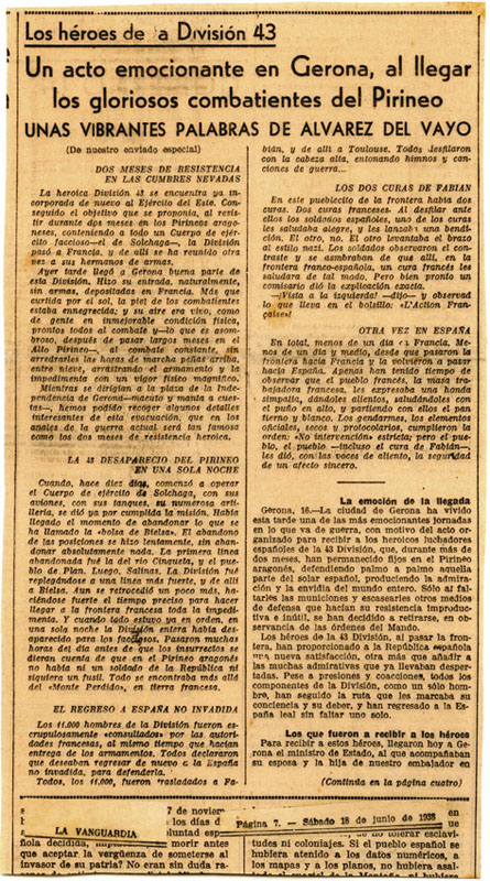 Contenido: La Vanguardia, nº 23172, 18-06-1938, p. 1, p. 4. Noticia de la llegada de los combatientes de la 43ª División a Gerona, donde se produjo un acto oficial con numerosas personalidades y con un discurso del ministro de Estado Julio Álvarez del Vayo. Se relata los últimos días de ataques franquistas y como la División se replegó y pasó la frontera.