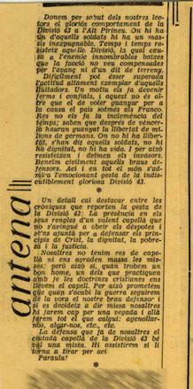 | Contenido: La Humanitat, 26-05-1938. Noticia de que en las filas de la 43ª División hay un capellán que no comulga con la jerarquía eclesiástica, predicando con las teorías esenciales del cristianismo. |