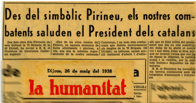| Contenido: La Humanitat, 26-05-1938. Trascripción del mensaje que la 72ª Brigada Mixta de la 43ª División ha mandado al presidente de la Generalitat de Catalunya. |