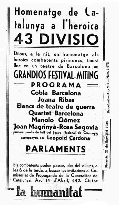 | Contenido: La Humanitat, nº 1971, 21-06-1938. Anuncio del acto de homenaje a la 43ª División con un festival - miting. |