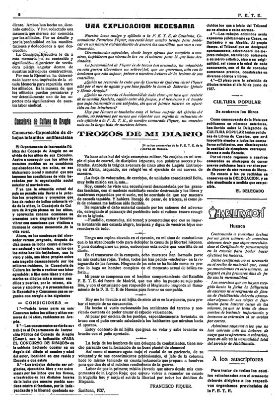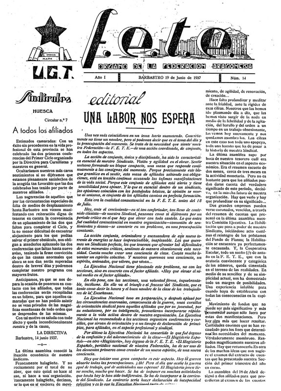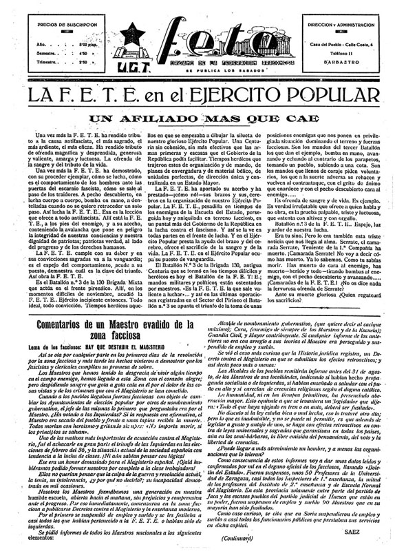 | Contenido: F.E.T.E. Órgano de la Federación Aragonesa, nº 14, 19-06-1937. Contiene en la página 4 referencia a la muerte del teniente Serrate de la 1ª Compañía de la 130ª Brigada Mixta de la 43ª División. |