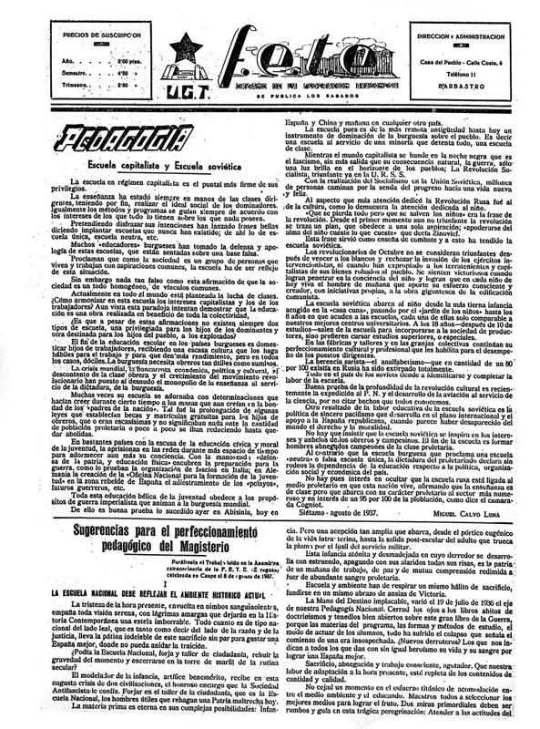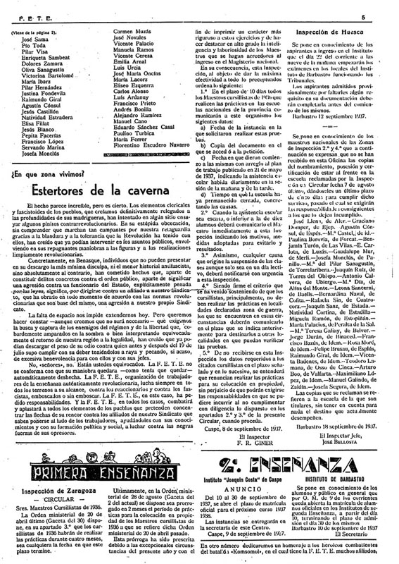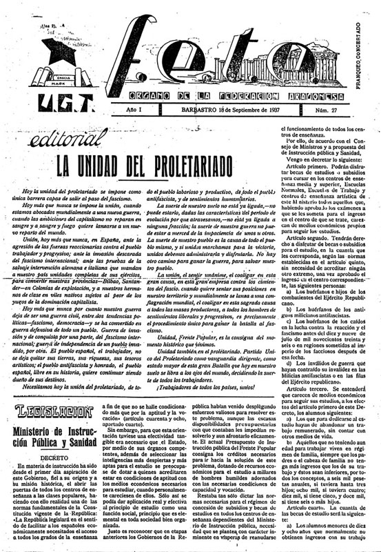 | Contenido: F.E.T.E. Órgano de la Federación Aragonesa, nº 27, 18-09-1937. Contiene en la página 2 una lista de altas sindicales en las que aparece Lorenzo Berdala. |