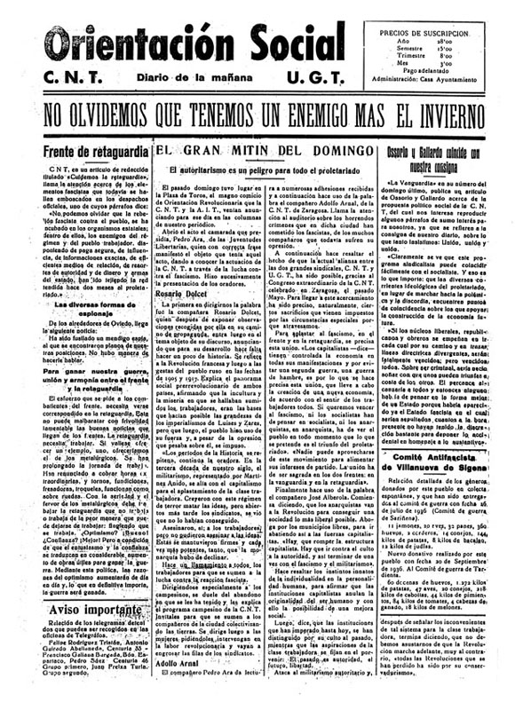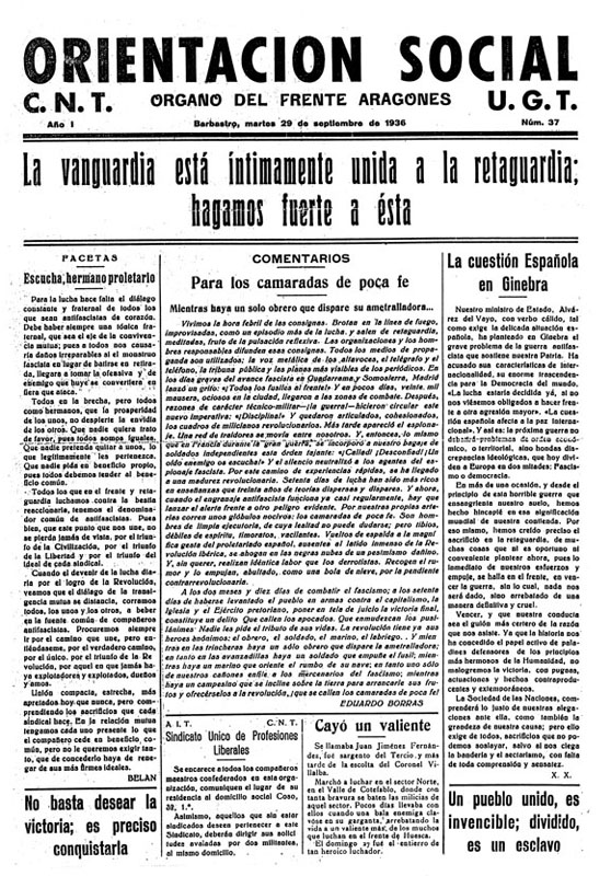 | Contenido: Orientación Social, Órgano del Frente Aragonés, nº 37, 29-09-1936. |