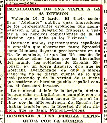 | Contenido: ABC. Diario republicano de izquierdas, nº 10952, 11-06-1938, p. 4. Contiene la reseña de una noticia publicada en el diario “Adelante” acerca de una visita a las posiciones de la 43ª División por parte de una delegación francesa compuesta por Monizet y Zyronski. |