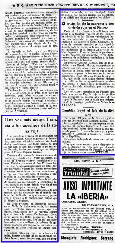 Contenido: ABC, nº 10934, 17-06-1938, p. 10. Contiene noticia de la retirada de la 43ª División a Francia y de las destrucciones llevadas a cabo por la misma en su retirada. Se denuncia la permisividad de Francia. Referencia a Beltrán. |