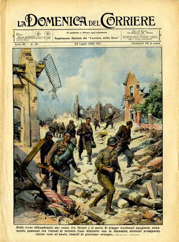 Según la propia terminología del periódico, tropas nacionales entrando en un pueblo abandonado por los rojos. |