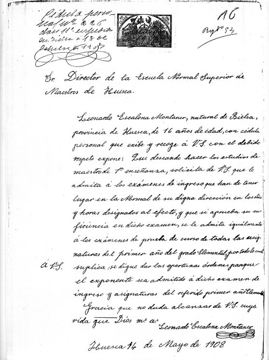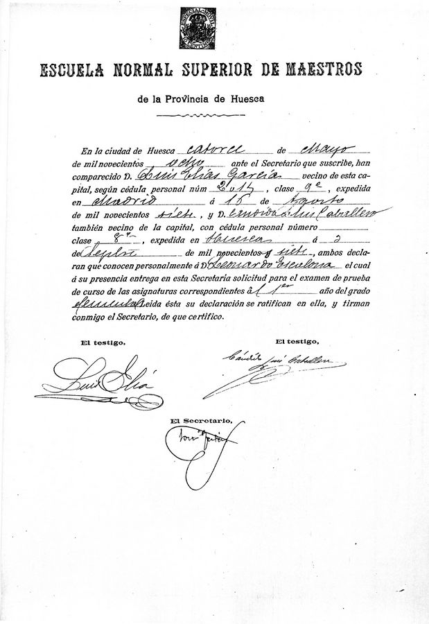 Nota: En esta serie aportamos el expediente académico conservado en el Archivo Histórico Provincial de Huesca correspondiente a sus estudios de maestro en la Escuela Normal Superior de Maestros de Huesca. Ver la biografía completa en el libro: Escalona y Montaner, Leonardo; La Fiesta del Árbol; edición facsímil; Museo Pedagógico de Aragón; Huesca, 2009. La obra literaria y la biografía del maestro Leonardo Escalona están bien estudiadas en la instrucción de Chusé Raúl Usón. ISBN: 978-84-8380-168-0 |