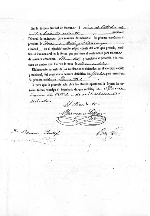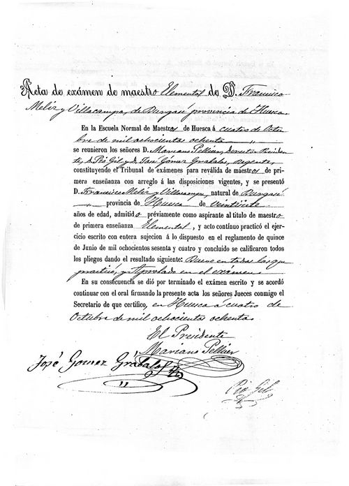 Contenido: Francisco Méliz Villacampa era natural de Burgasé, nacido probablemente hacia 1853. Según la información del Servicio Provincial de Educación de Huesca tomó posesión de su plaza en Bielsa el 23 de octubre de 1882. Posteriormente es cesado y vuelto a incorporar en el año 1913, aunque no consta el año de su cese definitivo como maestro. Fue maestro de Leonardo Escalona Montaner, natural de Bielsa y también maestro, del que se puede consultar el expediente académico en el Fondo Museo de Bielsa. Ejercicios de las pruebas de Maestro de Primera Enseñanza Elemental y Acta final del Aprobado. |