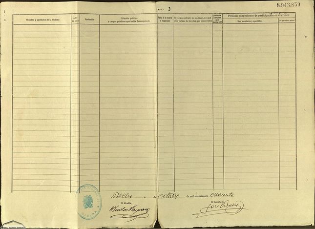 | Nota: Expediente 60. Archivo Histórico Nacional; Instituciones Contemporáneas; Poder Judicial; Fiscalía del Tribunal Supremo; Causa General. Cada hoja está numerada en este conjunto del 1 al 13. |