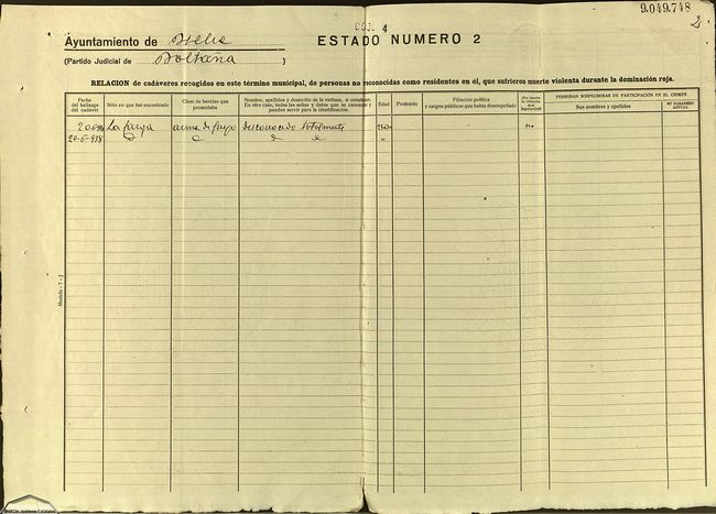 Cada expediente costa de dos partes, la primera se estructura en tres cuestionarios cerrados: el primero sobre la relación de personas residentes en el municipio que fueron asesinados por la dominación roja. El segundo cuestionario sobre la relación de cadáveres aparecidos en el término municipal, y el tercer cuestionario sobre las destrucciones y otros hechos delictivos. La segunda parte son documentos de correspondencia oficial entre las autoridades locales y el Juez Instructor sobre solicitud de información, explicaciones de hechos o personas que aparecen en los cuestionarios y declaraciones de testigos.