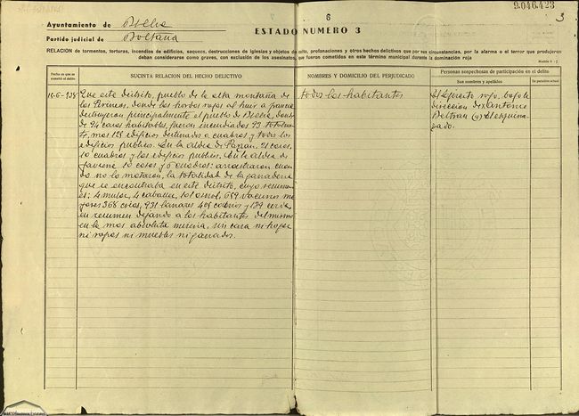 El expediente de Bielsa es bien escueto sobre asesinatos de personas en relación a otros municipios, pero contiene una descripción muy valiosa sobre la versión que las nuevas autoridades dan de la destrucción de Bielsa y el municipio. Versión oficial que se mantiene durante toda la dictadura hasta que las nuevas investigaciones realizadas durante la recuperación de la democracia desmienten la versión oficial. Posiblemente es el primer texto escrito de la destrucción de Bielsa en la versión oficial del franquismo. Página 6. |