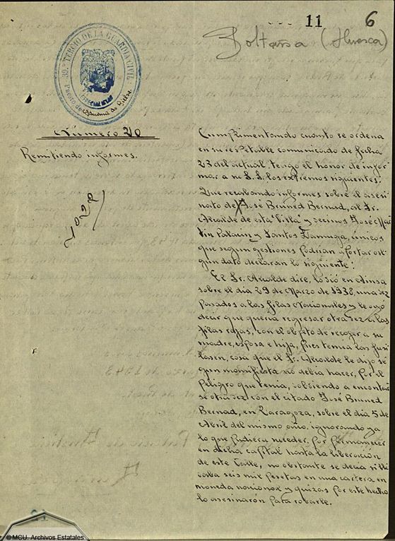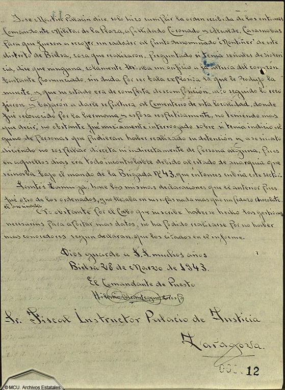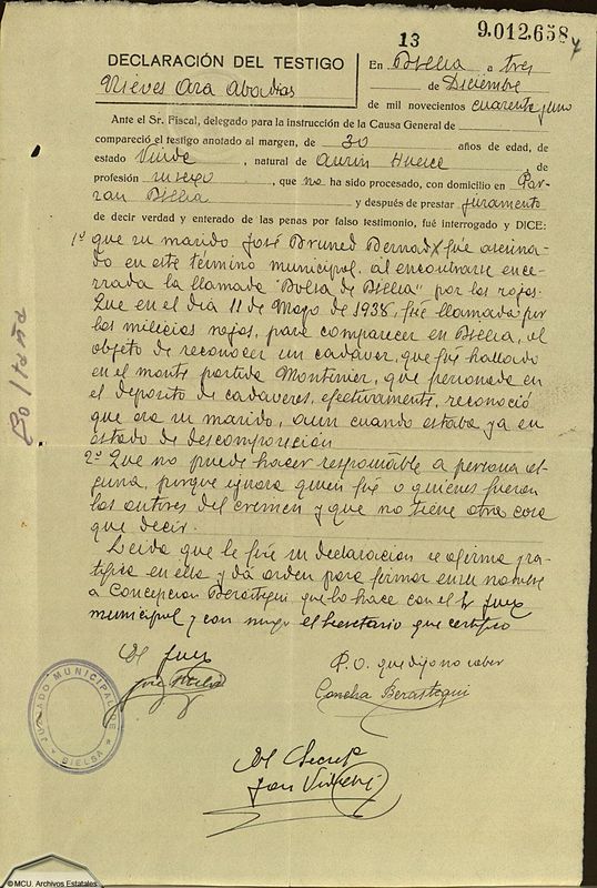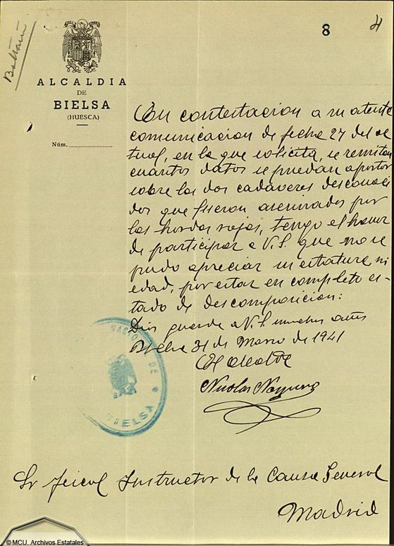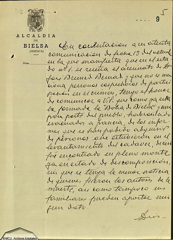 El expediente de Bielsa es bien escueto sobre asesinatos de personas en relación a otros municipios, pero contiene una descripción muy valiosa sobre la versión que las nuevas autoridades dan de la destrucción de Bielsa y el municipio. En esta parte del expediente la correspondencia entre el Ayuntamiento y el puesto de la Guardia Civil sobre la muerte de José Bruned Bernad, así como la declaración como Testigo de su esposa. Páginas 8 a la 13. |