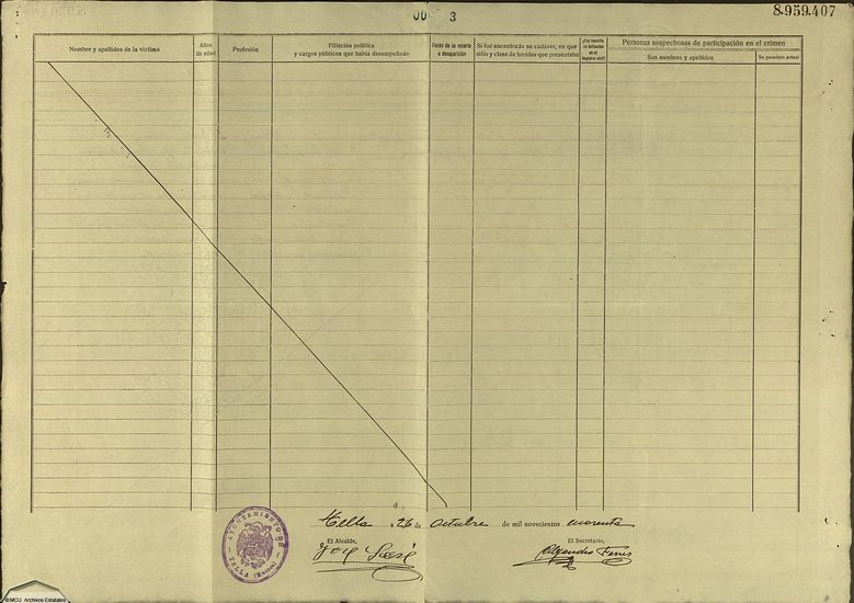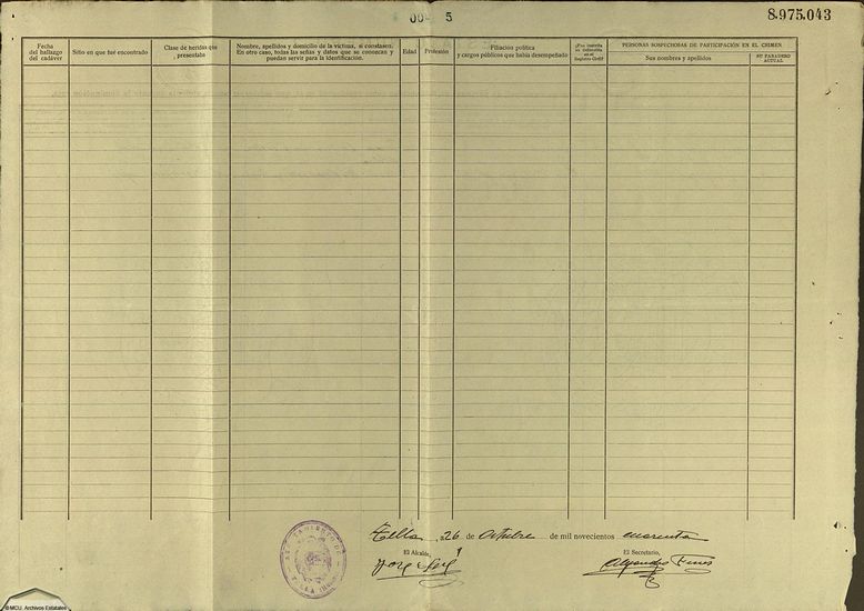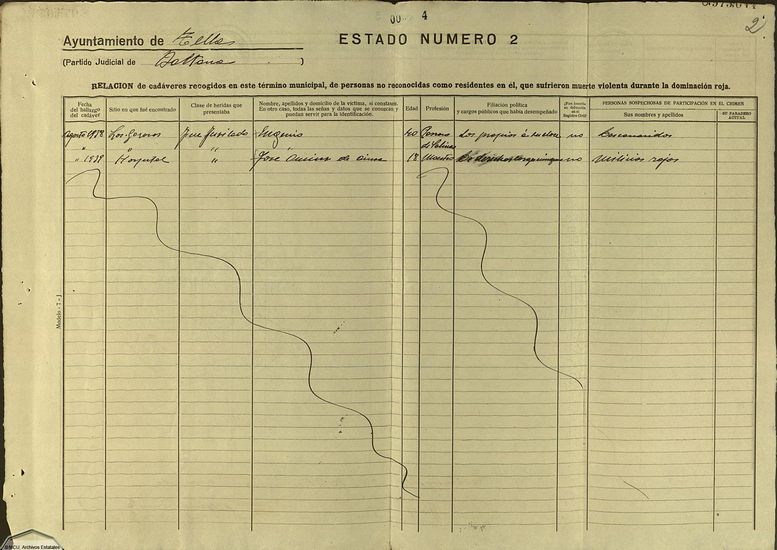Cada expediente costa de dos partes, la primera se estructura en tres cuestionarios cerrados: el primero sobre la relación de personas residentes en el municipio que fueron asesinados por la dominación roja. El segundo cuestionario sobre la relación de cadáveres aparecidos en el término municipal, y el tercer cuestionario sobre las destrucciones y otros hechos delictivos. La segunda parte son documentos de correspondencia oficial entre las autoridades locales y el Juez Instructor sobre solicitud de información, explicaciones de hechos o personas que aparecen en los cuestionarios y declaraciones de testigos. Esta primera unidad documental consta de los formularios donde se recogen los hombres del término municipal que fueron arrestados y fusilados en los primeros meses del alzamiento. En el tercer formulario aparece la descripción de la destrucción del pueblo de Lafortunada y de la Central Eléctrica. |