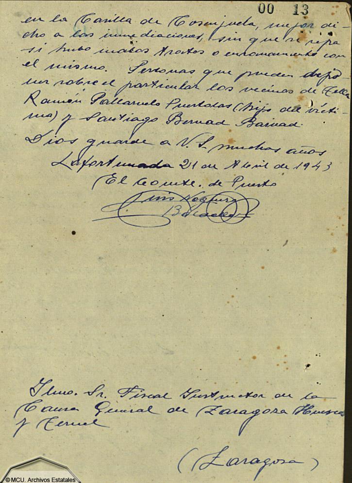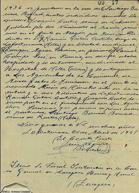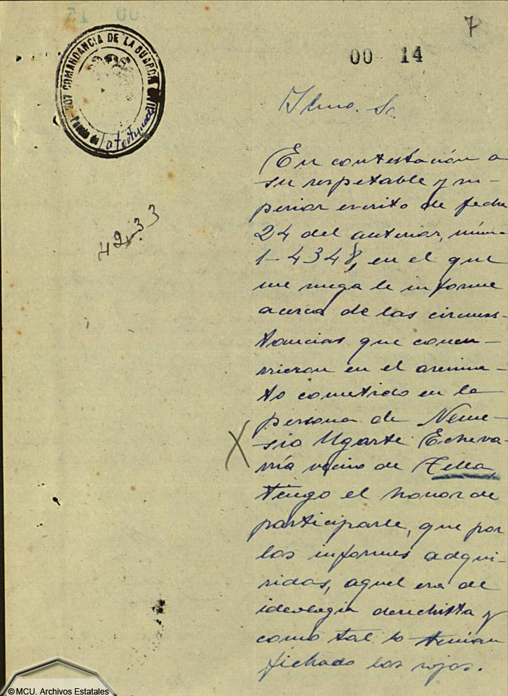 Cada expediente costa de dos partes, la primera se estructura en tres cuestionarios cerrados: el primero sobre la relación de personas residentes en el municipio que fueron asesinados por la dominación roja. El segundo cuestionario sobre la relación de cadáveres aparecidos en el término municipal, y el tercer cuestionario sobre las destrucciones y otros hechos delictivos. La segunda parte son documentos de correspondencia oficial entre las autoridades locales y el Juez Instructor sobre solicitud de información, explicaciones de hechos o personas que aparecen en los cuestionarios y declaraciones de testigos. Esta unidad documental consta de los informes del año 1943 generados por el comandante de la 207 Comandancia de la Guardia Civil con puesto en Lafortunada. El comandante genera tres informes, uno por cada una de las declaraciones de los testigos del año 1942 y ratifica la información de los mismos. |