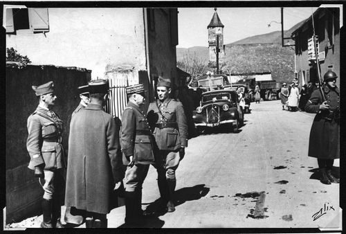 | Descripción: Visita del general francés Chauvin del 18ª Corps d’Armée, al valle del Aure para supervisar el despliegue de seguridad de la frontera. La visita se produjo el 8 de abril de 1938 y estuvo en las poblaciones de Arreau, Saint-Lary y Aragnouet. En esta imagen pasando revista a las tropas en Saint-Lary. ... |