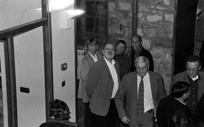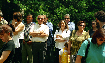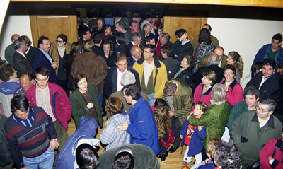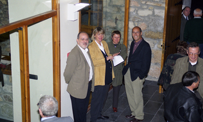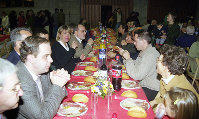 | Descripción: María Ángeles Escalona y José Mur (casa Monclús), los más mayores, fueron los encargados de dar las palabras de bienvenida al obispo; a su derecha, Fernando Roy, María Nieves Pañart, M. C. Mazcaray y Serafina.... |